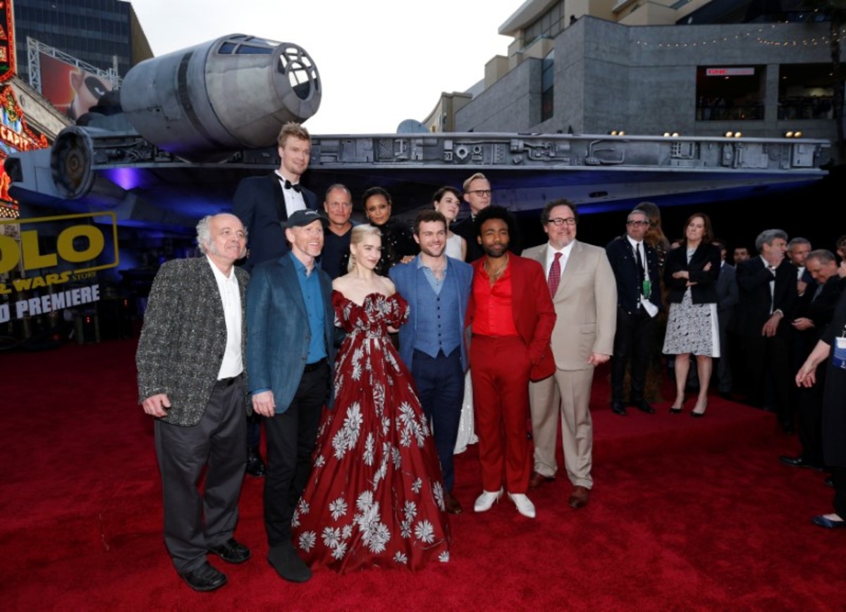 Director of the movie Ron Howard (2nd L) poses with cast members (L-R) Clint Howard, Joonas Suotamo, Woody Harrelson, Emilia Clarke, Thandie Newton, Alden Ehrenreich, Phoebe Waller-Bridge, Paul Bettany, Donald Glover and Jon Favreau at the premiere for the movie "Solo: A Star Wars Story" in Los Angeles, California, U.S., May 10, 2018. REUTERS/Mario Anzuoni