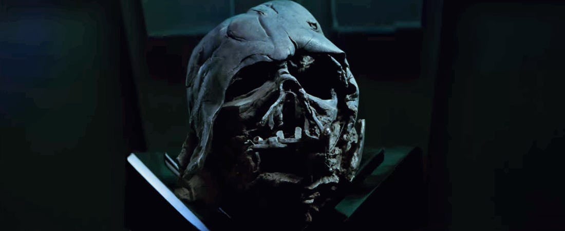 This character design could have another, deeper meaning which goes beyond a visual trigger for Kylo Ren. Just as we are hard-wired to see faces in things, we associate asymmetry with grotesqueness — the eviscerated mask and Snoke's partially-formed structure are unfamiliar and therefore evil. So while it's affecting Kylo's perception, it's also affecting ours.