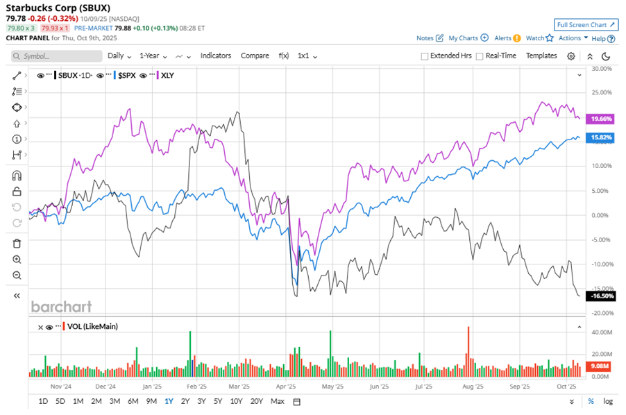 SBUX stock has underperformed the S&P 500 Index’s ($SPX) 16.3% gains over the past 52 weeks, with shares down 15% during this period. Similarly, it underperformed the Consumer Discretionary Select Sector SPDR Fund’s (XLY) 19.1% gains over the same time frame.