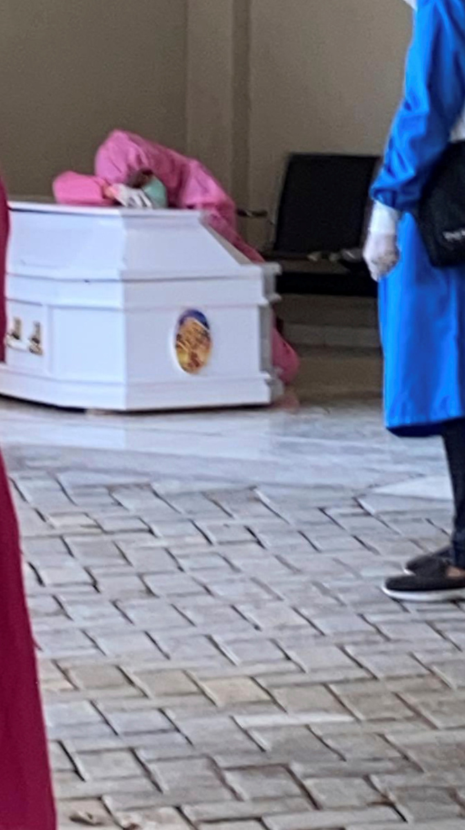 They show a woman, whose face is barely visible, dressed in a pink hazmat suit, gloves, and turquoise mask, alone as she rests her head on a white coffin.