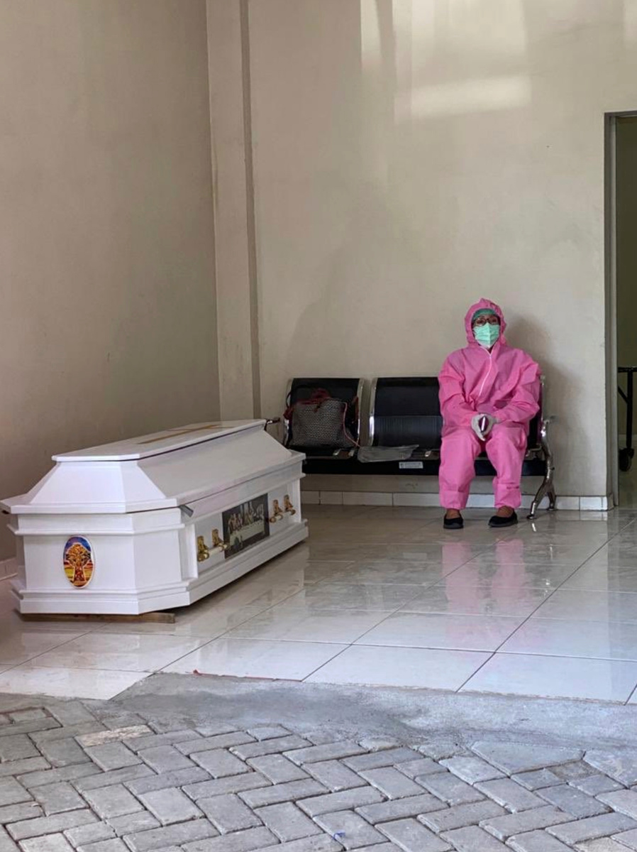 Photographs of a grieving wife bent over the coffin of her dead husband, an Indonesian medical doctor, have drawn attention to the high death toll of healthcare workers in the Southeast Asian nation.