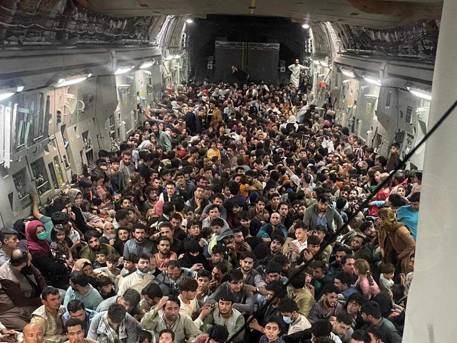 The picture, which was obtained by US defence and security news site Defense One, is believed to show 640 people crammed into a C-17 Globemaster III, among the highest number of people ever carried in such an aircraft.