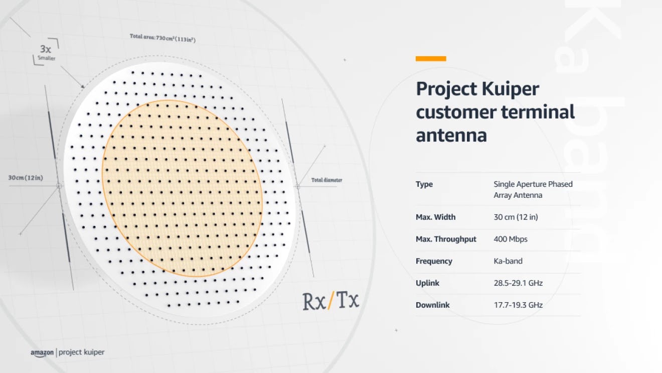 How does it compare to Starlink? — Little is known at this stage, but Kuiper could be competitive. The satellites orbit at a similar altitude and Kuiper’s 12-inch diameter user terminal antenna is far smaller than Starlink’s 23-inch diameter antenna.