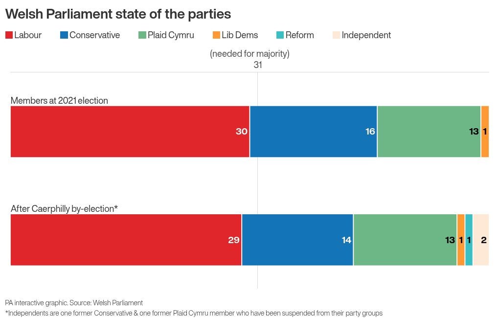 While Labour is the largest party, it does not have a majority, and the next budget vote will be even more difficult after losing the Caerphilly seat.