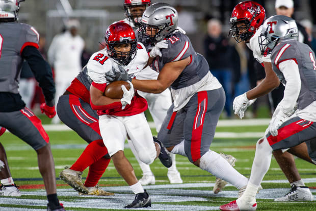 Perry finished a monster senior season with 23 sacks and nearly 40 quarterback hurries. He is known to come off the edge but showed some power in holding the point inside against a massive Pleasant Grove offensive line, the benefit-of-the-doubt type floor that college coaches at Alabama, Auburn, Clemson and UCF see plenty from. A decision awaits on December 15 and Perry told SI he hasn't locked in the call just yet, privately.