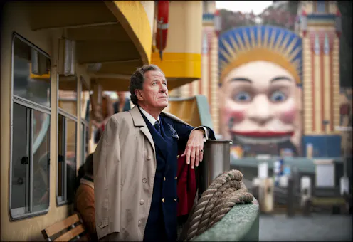 Also on display is Matt Nettheim’s fine portrait of Geoffrey Rush as Sir Basil Hunter in the Fred Shepisi-directed film based on Patrick White’s novel, The Eye of the Storm. The long, patrician face of Hunter/Rush, wearing a ruminative expression, is brilliantly juxtaposed against the crass happy-smiley face of the entrance to Sydney’s Lunar Park.