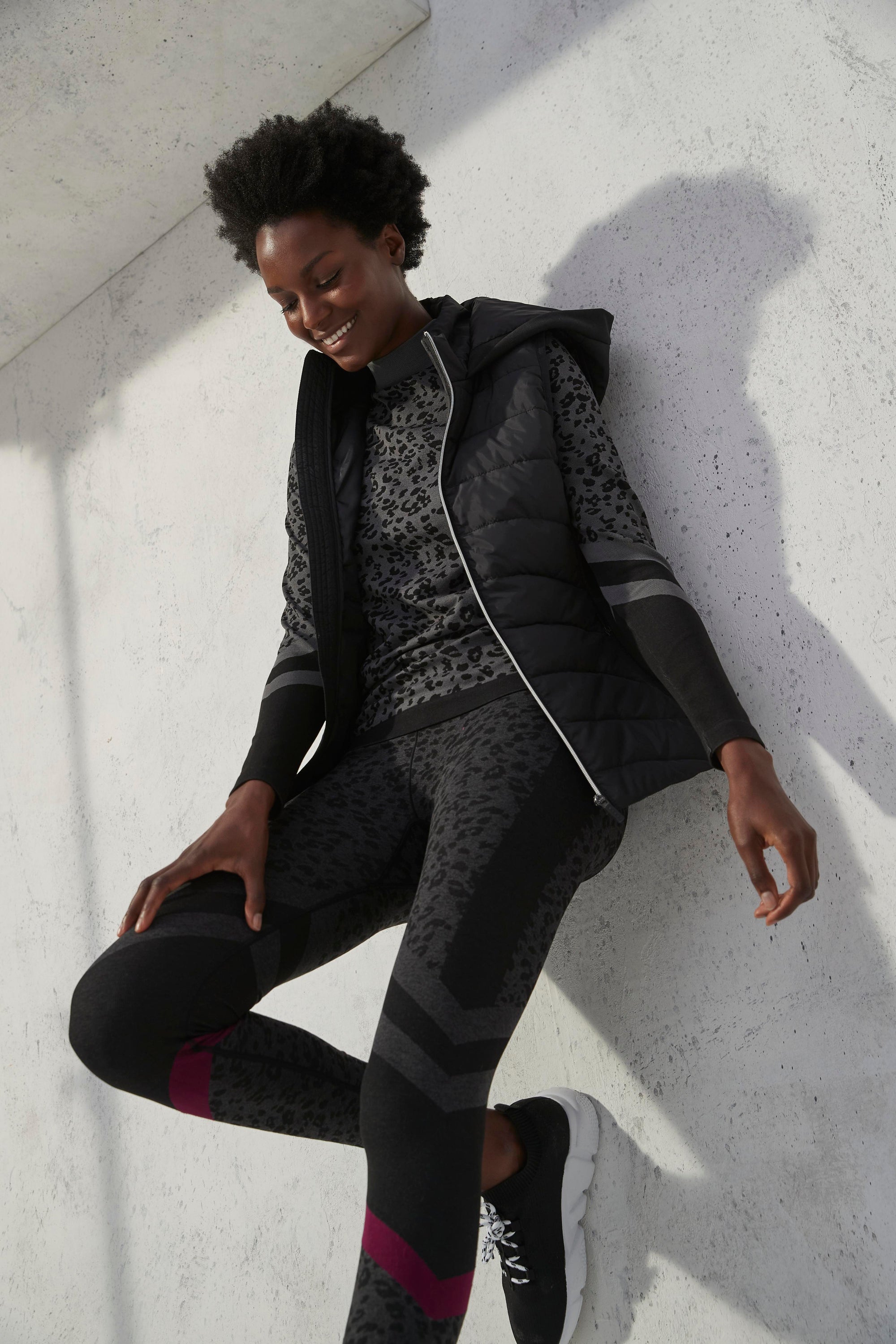 Matalan Souluxe Animal Seamless Top, £12.50; Matalan Souluxe Animal Seamless Leggings, £14; Souluxe Gilet, £18; Trainers £14 (available in September)