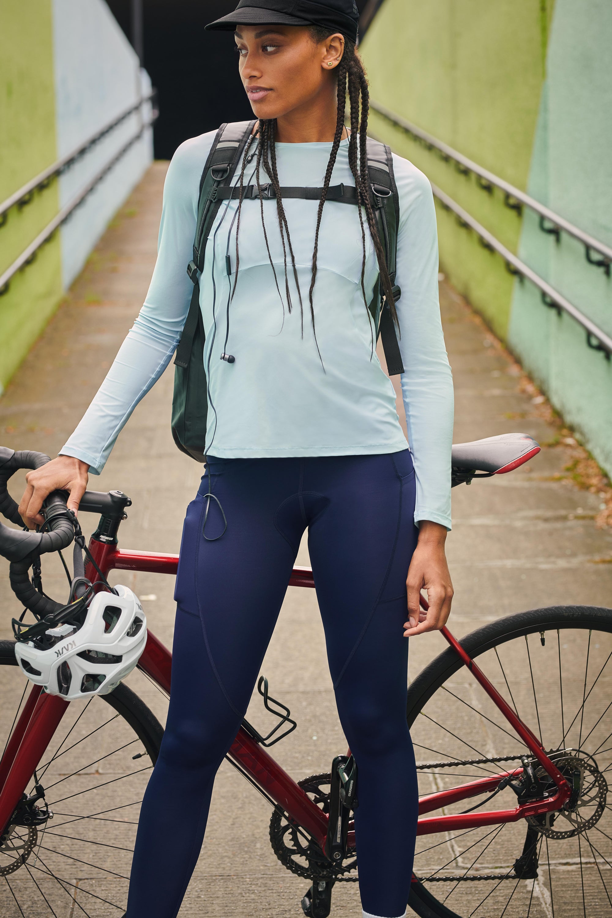 Sweaty Betty Commuter Slim Long Sleeve Top, £75; Velo Padded 7/8 Cycling Leggings, £115; Cycling Back Pack, £95; Kask Mojito Helmet, £169