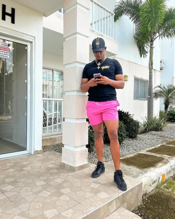 The photo shows Edgar standing outdoors, phone in hand, capturing a moment amidst the hustle and bustle of everyday life. The sky above is cloudy, hinting at a possibility of rain, yet Edgar seems undeterred. His attire is equally intriguing, with a black shirt, pink shorts, black shoes, and a matching cap. This eclectic choice reflects his personal style and creativity.