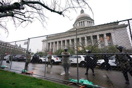 Washington Gov. Jay Inslee activated hundreds of National Guard troops to help state police keep order at the state Capitol and defend security fencing. At least two people were arrested, including a woman who, according to state police, used a recreational vehicle to block a roadway and refused to comply with orders to move.
