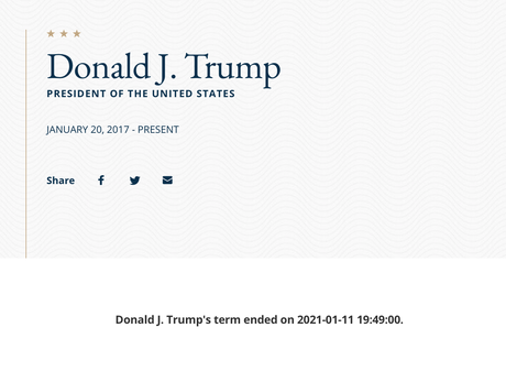 The page was edited at least twice, with two different times, reading “Donald J. Trump's term ended on 2021-01-11 19:49:00” and "Donald J. Trump's term ended on 2021-01-11 19:22:18."