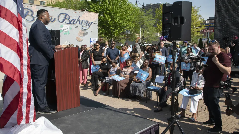 He was greeted with cheers and applause from about 50 people Thursday afternoon as he walked to a podium set up outside TeaPotBrew Bakery, 1802 S. Wabash Ave., on the Near South Side to kick off his campaign. The crowd included his mother, a longtime CPS teacher.