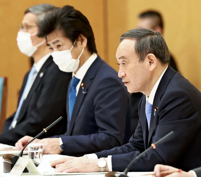 During the meeting, Suga called on people, including those living outside of Tokyo and the three neighboring prefectures, to refrain from dining together, except within families, or in groups of four people or less. He also indicated an intention to work out measures, within this month, to support women, nonregular workers and others who have become more isolated in society and have suffered distress due to the pandemic.