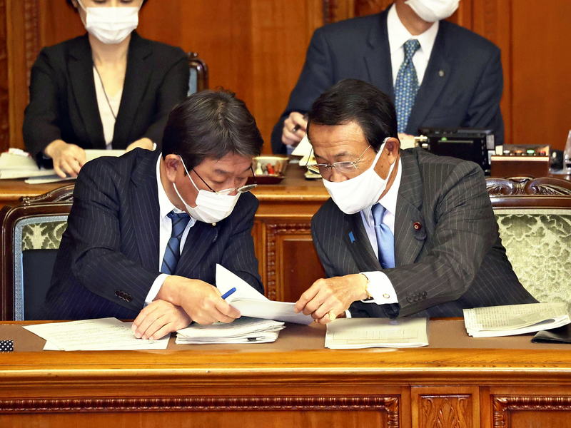While Suga was answering questions, Deputy Prime Minister and Finance Minister Taro Aso and Foreign Minister Toshimitsu Motegi huddled together and continued to whisper. Despite being jeered, the two ministers were so absorbed in talking about the prospects for the U.S. presidential election in November and the Chiba gubernatorial election set for next April that Deputy Chief Cabinet Secretary Naoki Okada was forced to call out to them.