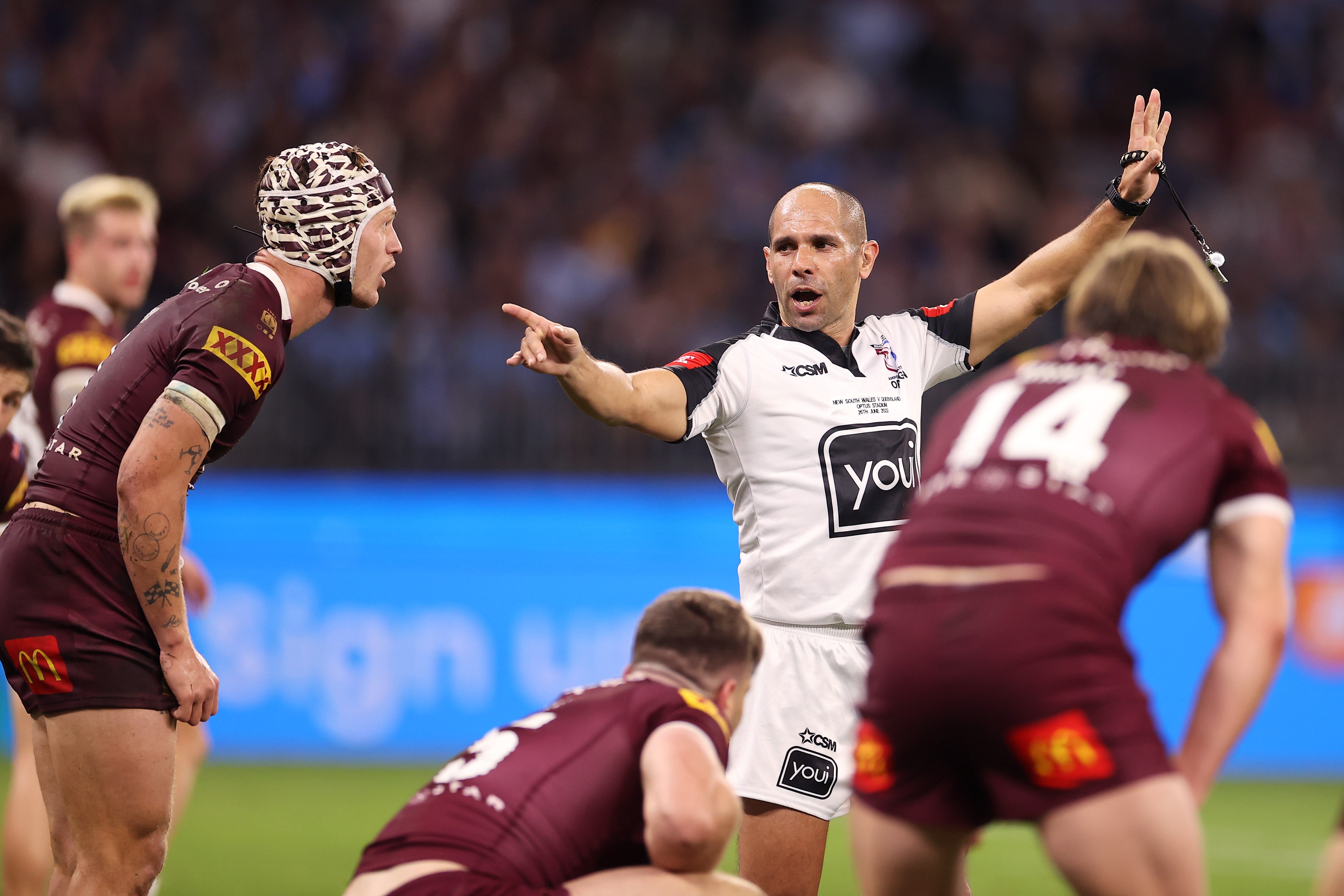 Referee Ashley Klein awarded the Blues four repeat sets for Queensland ruck infringements but eventually he had enough and sent Felise Kaufusi to the bin.