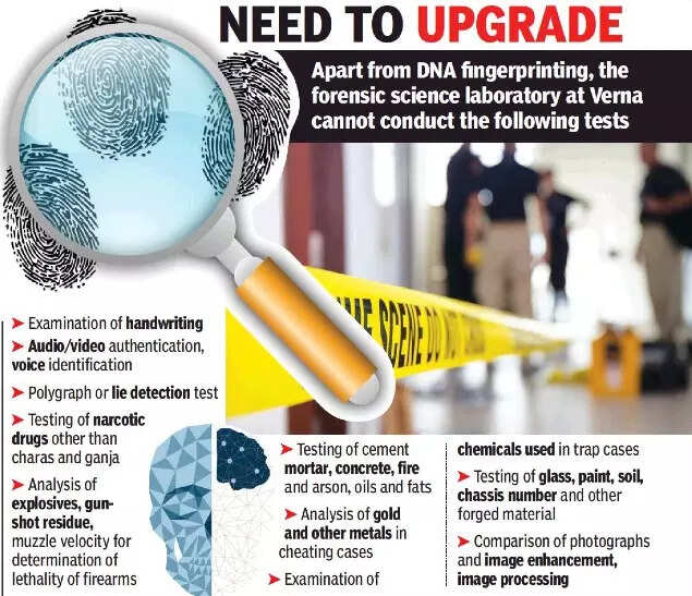 The forensic science laboratory at Verna comprises biology/ serology, chemistry, toxicology, narcotics, ballistics, computer forensic and fingerprint divisions. However, certain tests, including DNA fingerprinting, aren’t conducted at this laboratory, and therefore, samples are required to be sent to the Centre for DNA Fingerprinting and Diagnostics (CDFD) and Central Forensic Science Laboratory (CFSL), both located at Hyderabad.