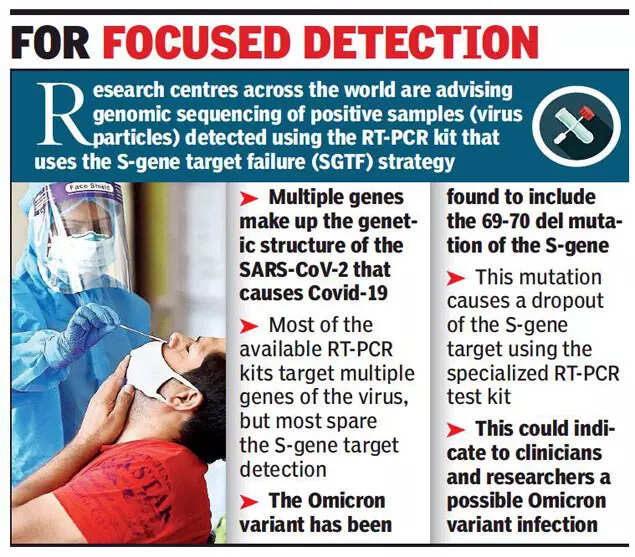 “And only those samples showing positive for S-gene drop-out or S-gene target failure (SGTF) will be genomically sequenced for Omicron. Besides cost-cutting, it will also help in picking up the highly probable Omicron cases and save resources,” a senior Union health ministry official told TOI on Monday.