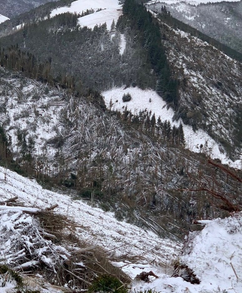 Photos showed hundreds of trees in Kidland Forest in Northumberland that had blown over.