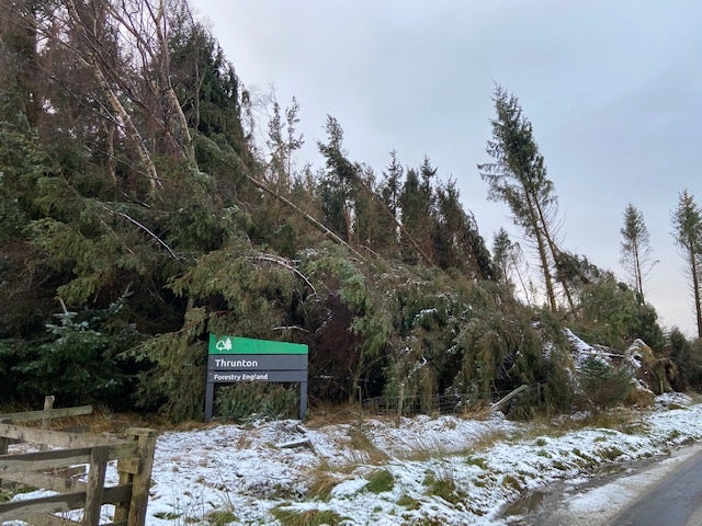 It listed Thrunton Woods, Kidland, Harbottle and Simonside near Rothbury, Kielder, Hamsterley and Chopwell in the North East, plus Grizedale Forest and Gisburn in the North West, as being badly affected by uprooted trees, loose branches, downed power lines and blocked access.