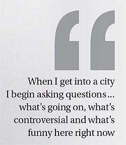 "I read as much as I can online to get a quick overview [of a country] and when I get into a city I immediately begin asking questions. As soon as I'm in the car from the airport I start asking locals questions about what's going on, what's controversial and what's funny here right now."