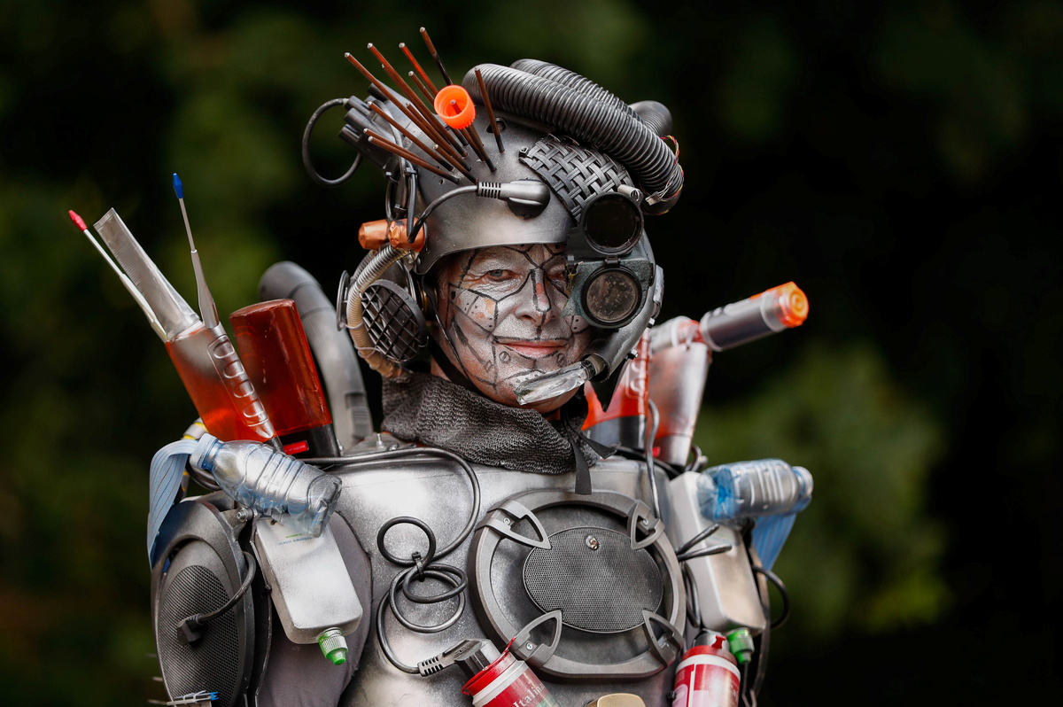 An artist called "The Trashformer" takes part in the festival "Statues en Marche" in Marche-en-Famenne, Belgium, July 22, 2018. REUTERS/Yves Herman