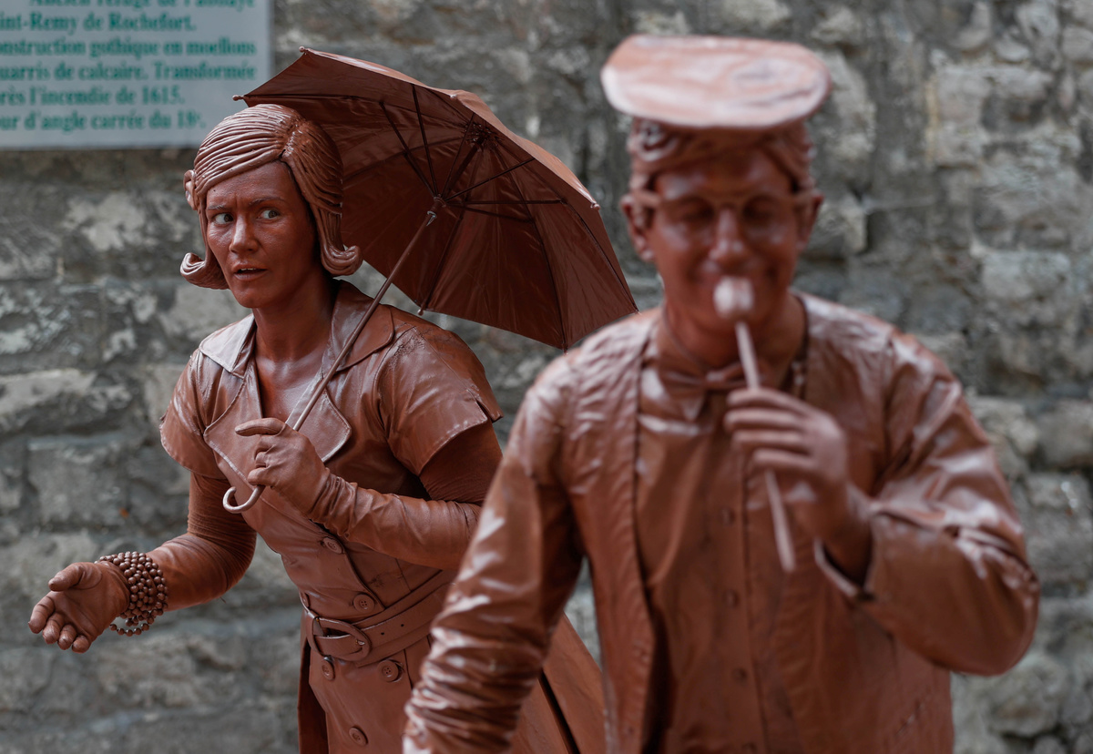 Artists called "Le couple en chocolat" take part in the festival "Statues en Marche" in Marche-en-Famenne, Belgium, July 22, 2018. REUTERS/Yves Herman