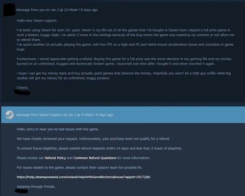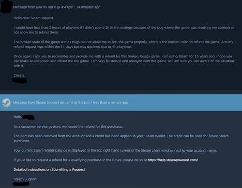 But after some earnest pleading, this refund likely occurred because Roboserg explained that they spent multiple hours stuck in the game’s settings. They explained that “the broken state of the game and its bugs” made it impossible for them to test out the game or set keybinds and begged Steam for a refund for the “broken, buggy game.” After the explanation, Steam chose to refund them for the game.