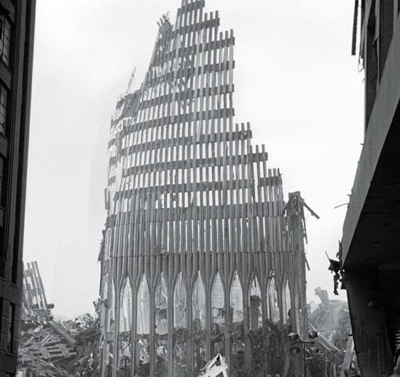 It was part of the South Tower, still 18 stories in height, and caught by the arc lights that had been set up by the emergency teams. It was, literally, steel still standing.