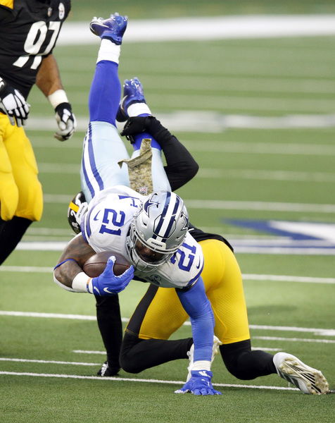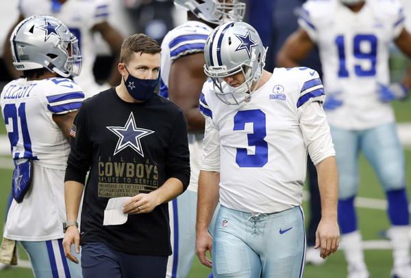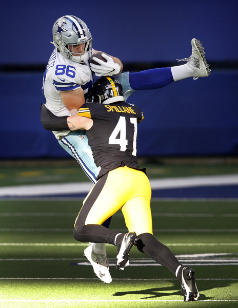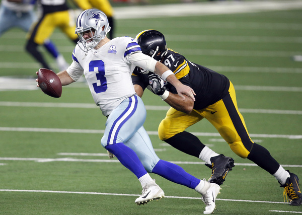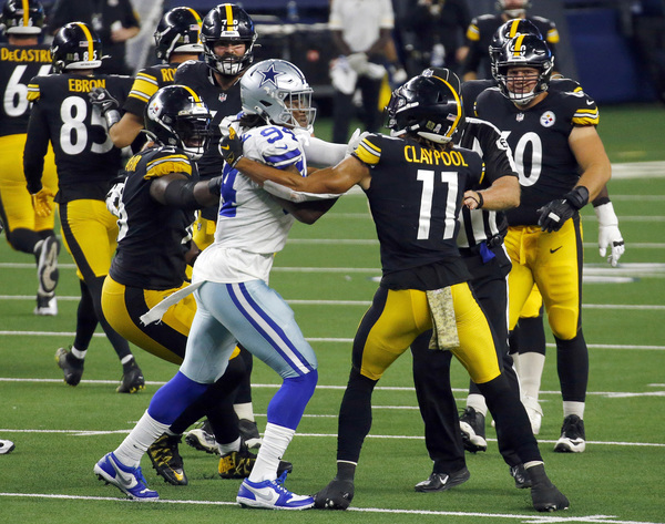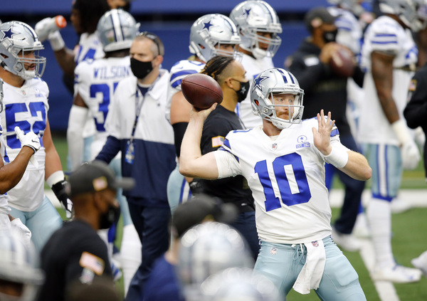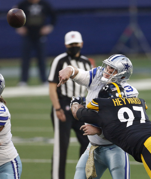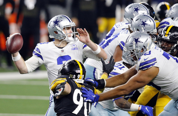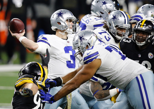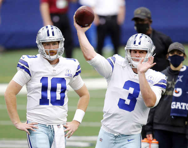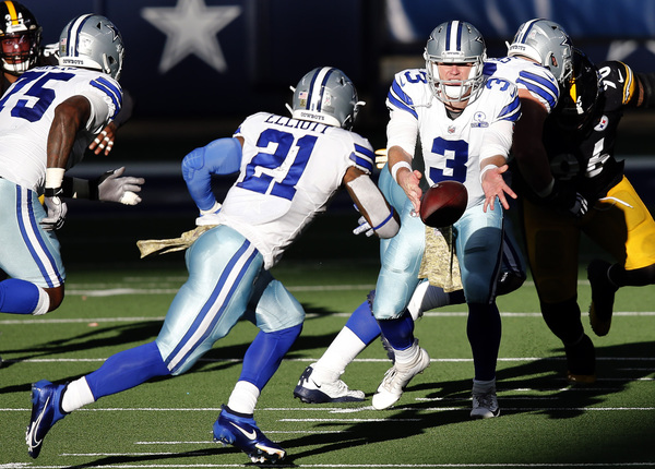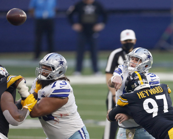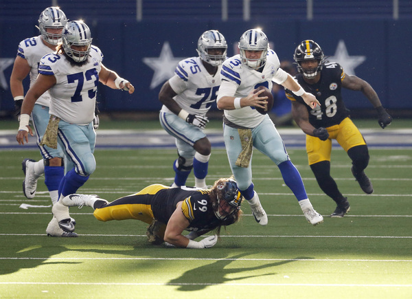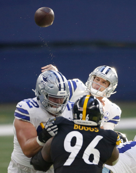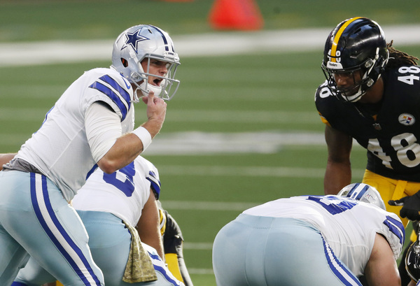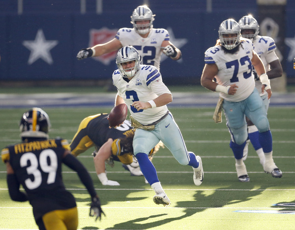 Dallas Cowboys wide receiver CeeDee Lamb (88) pulls in a second quarter touchdown pass against the Pittsburgh Steelers on Sunday, Nov. 8, 2020 at AT&T Stadium in Arlington, Texas. (Tom Fox/The Dallas Morning News/TNS)Dallas Cowboys quarterback Garrett Gilbert (3) evades Pittsburgh Steelers defensive tackle Henry Mondeaux (99) as he runs for a first down during the second quarter on Sunday, Nov. 8, 2020 at AT&T Stadium in Arlington, Texas. (Vernon Bryant/The Dallas Morning News/TNS)Dallas Cowboys wide receiver CeeDee Lamb (88) fumbles the ball into the arms of Pittsburgh Steelers free safety Minkah Fitzpatrick (39) during the second quarter on Sunday, Nov. 8, 2020 at AT&T Stadium in Arlington, Texas. (Tom Fox/The Dallas Morning News/TNS)Dallas Cowboys quarterback Garrett Gilbert (3) looks down the field as he runs against the Pittsburgh Steelers during the second quarter on Sunday, Nov. 8, 2020 at AT&T Stadium in Arlington, Texas. (Vernon Bryant/The Dallas Morning News/TNS)Dallas Cowboys quarterback Garrett Gilbert (3) throws from the pocket as he gets blocking from his linemen against the Pittsburgh Steelers in the fourth quarter on Sunday, Nov. 8, 2020 at AT&T Stadium in Arlington, Texas. (Tom Fox/The Dallas Morning News/TNS)Dallas Cowboys quarterback Garrett Gilbert (3) lays on the turf after being crushed by Pittsburgh Steelers defensive end Cameron Heyward (97) late in the fourth quarter on Sunday, Nov. 8, 2020 at AT&T Stadium in Arlington, Texas. (Tom Fox/The Dallas Morning News/TNS)Dallas Cowboys starting quarterback Garrett Gilbert (3) throws a pass as backup Cooper Rush watches during pregame warmups before a game against the Pittsburgh Steelers on Sunday, Nov. 8, 2020 at AT&T Stadium in Arlington, Texas. (Tom Fox/The Dallas Morning News/TNS)Dallas Cowboys quarterback Garrett Gilbert (3) runs for a first down against the Pittsburgh Steelers during the second quarter on Sunday, Nov. 8, 2020 at AT&T Stadium in Arlington, Texas. (Vernon Bryant/The Dallas Morning News/TNS)Dallas Cowboys quarterback Garrett Gilbert (3) is hit as he throws by Pittsburgh Steelers defensive end Cameron Heyward (97) during the second quarter on Sunday, Nov. 8, 2020 at AT&T Stadium in Arlington, Texas. (Vernon Bryant/The Dallas Morning News/TNS)NFL officials measure the distance after a third down run play from the Dallas Cowboys against the Pittsburgh Steelers during the first quarter on Sunday, Nov. 8, 2020 at AT&T Stadium in Arlington, Texas. (Vernon Bryant/The Dallas Morning News/TNS)Dallas Cowboys quarterback Cooper Rush (10) throws a pass during pregame warmups before a game against the Pittsburgh Steelers on Sunday, Nov. 8, 2020 at AT&T Stadium in Arlington, Texas. (Tom Fox/The Dallas Morning News/TNS)Dallas Cowboys quarterback Garrett Gilbert (3) throws from the pocket as he gets blocking from his linemen against the Pittsburgh Steelers in the fourth quarter on Sunday, Nov. 8, 2020 at AT&T Stadium in Arlington, Texas. (Tom Fox/The Dallas Morning News/TNS)Dallas Cowboys center Joe Looney (73) points at a defender before snapping the ball to quarterback Garrett Gilbert (3) against the Pittsburgh Steelers during the first quarter on Sunday, Nov. 8, 2020 at AT&T Stadium in Arlington, Texas. (Vernon Bryant/The Dallas Morning News/TNS)Dallas Cowboys running back Ezekiel Elliott (21) is stopped by Pittsburgh Steelers defensive end Stephon Tuitt (91) on a run play during the first quarter on Sunday, Nov. 8, 2020 at AT&T Stadium in Arlington, Texas. (Vernon Bryant/The Dallas Morning News/TNS)Pittsburgh Steelers punter Jordan Berry (4) punts the ball against the Dallas Cowboys during the first quarter on Sunday, Nov. 8, 2020 at AT&T Stadium in Arlington, Texas. (Vernon Bryant/The Dallas Morning News/TNS)Dallas Cowboys defensive end Randy Gregory (94) and Pittsburgh Steelers wide receiver Chase Claypool (11) tussle after a fourth quarter play on Sunday, Nov. 8, 2020 at AT&T Stadium in Arlington, Texas. The Cowboys lost, 24-19. (Tom Fox/The Dallas Morning News/TNS)Pittsburgh Steelers free safety Minkah Fitzpatrick (39) races past Dallas Cowboys quarterback Garrett Gilbert (3) after catching an interception in the end zone in the fourth quarter on Sunday, Nov. 8, 2020 at AT&T Stadium in Arlington, Texas. (Tom Fox/The Dallas Morning News/TNS)Dallas Cowboys quarterback Garrett Gilbert (3) evades Pittsburgh Steelers defensive tackle Henry Mondeaux (99) as he runs for a first down during the second quarter on Sunday, Nov. 8, 2020 at AT&T Stadium in Arlington, Texas. (Vernon Bryant/The Dallas Morning News/TNS)Dallas Cowboys cornerback Trevon Diggs (27) misses a tackle of Pittsburgh Steelers wide receiver Diontae Johnson (18) during the second quarter on Sunday, Nov. 8, 2020 at AT&T Stadium in Arlington, Texas. (Tom Fox/The Dallas Morning News/TNS)Dallas Cowboys quarterback Garrett Gilbert (3) receives a play from offensive coordinator Kellen Moore during pregame warmups before a game against the Pittsburgh Steelers on Sunday, Nov. 8, 2020 at AT&T Stadium in Arlington, Texas. (Tom Fox/The Dallas Morning News/TNS)Dallas Cowboys quarterback Garrett Gilbert (3) tries to elude a sack attempt by Pittsburgh Steelers defensive end Cameron Heyward (97) in the fourth quarter on Sunday, Nov. 8, 2020 at AT&T Stadium in Arlington, Texas. The Cowboys lost, 24-19. (Tom Fox/The Dallas Morning News/TNS)Dallas Cowboys safety Donovan Wilson (37) and cornerback Trevon Diggs (27) run into each other as they attempt to make an interception on a ball intended for Pittsburgh Steelers wide receiver Diontae Johnson (18) during the first quarter on Sunday, Nov. 8, 2020 at AT&T Stadium in Arlington, Texas. (Vernon Bryant/The Dallas Morning News/TNS)Pittsburgh Steelers tight end Eric Ebron (85) hurdles Dallas Cowboys cornerback Saivion Smith (32) to score the winning touchdown in the fourth quarter on Sunday, Nov. 8, 2020 at AT&T Stadium in Arlington, Texas. The Cowboys lost, 24-19. (Tom Fox/The Dallas Morning News/TNS)Dallas Cowboys quarterbac