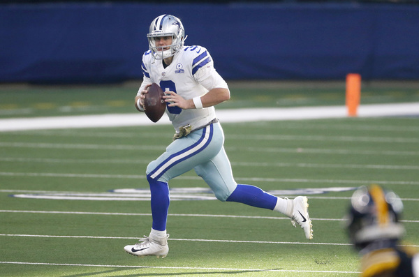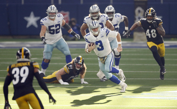 Dallas Cowboys quarterback Garrett Gilbert (3) runs for a first down against the Pittsburgh Steelers during the second quarter on Sunday, Nov. 8, 2020 at AT&T Stadium in Arlington, Texas. (Vernon Bryant/The Dallas Morning News/TNS)