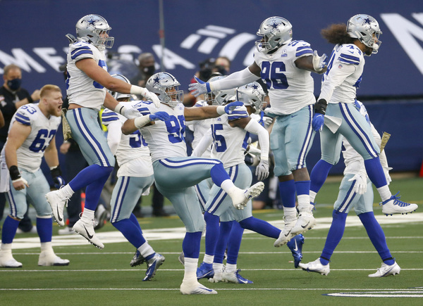 The Dallas Cowboys defense celebrates after making a stop on fourth down, forcing a change of possession from the Pittsburgh Steelers during the second quarter on Sunday, Nov. 8, 2020 at AT&T Stadium in Arlington, Texas. (Vernon Bryant/The Dallas Morning News/TNS)