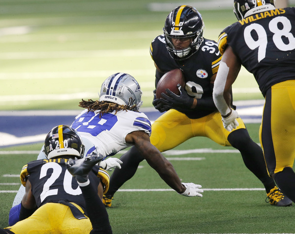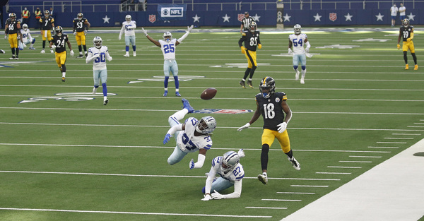 Dallas Cowboys safety Donovan Wilson (37) and cornerback Trevon Diggs (27) run into each other as they attempt to make an interception for a ball intended for Pittsburgh Steelers wide receiver Diontae Johnson (18) during the first quarter on Sunday, Nov. 8, 2020 at AT&T Stadium in Arlington, Texas. (Vernon Bryant/The Dallas Morning News/TNS)