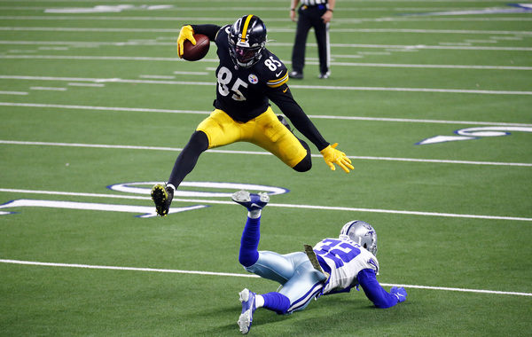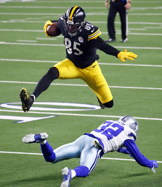 Pittsburgh Steelers tight end Eric Ebron (85) hurdles Dallas Cowboys cornerback Saivion Smith (32) to score the winning touchdown in the fourth quarter on Sunday, Nov. 8, 2020 at AT&T Stadium in Arlington, Texas. The Cowboys lost, 24-19. (Tom Fox/The Dallas Morning News/TNS)
