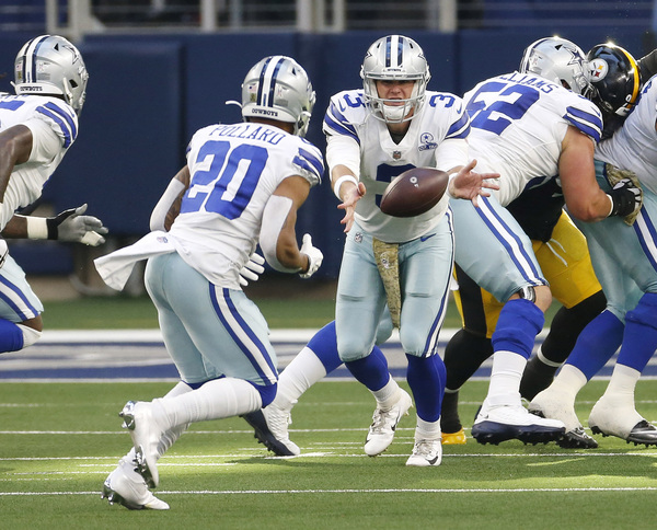 Dallas Cowboys quarterback Garrett Gilbert (3) tosses the ball to running back Tony Pollard (20) against the Pittsburgh Steelers during the first quarter on Sunday, Nov. 8, 2020 at AT&T Stadium in Arlington, Texas. (Vernon Bryant/The Dallas Morning News/TNS)