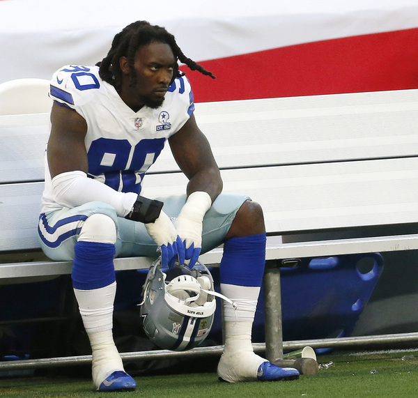 Dallas Cowboys defensive end DeMarcus Lawrence (90) on the bench against the Pittsburgh Steelers during the first quarter on Sunday, Nov. 8, 2020 at AT&T Stadium in Arlington, Texas. (Vernon Bryant/The Dallas Morning News/TNS)