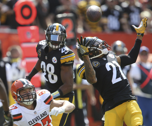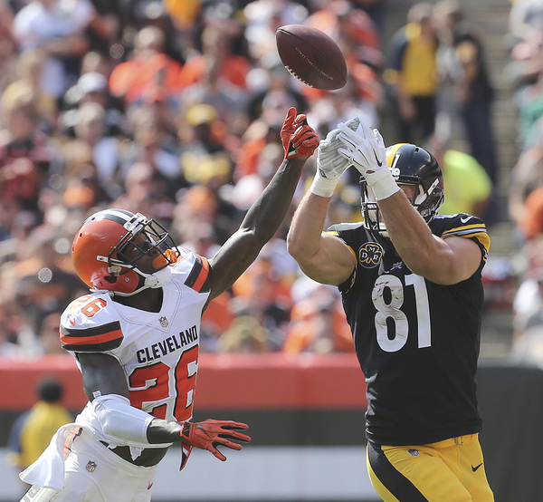The Steelers' best play on offense in the first half was nearly intercepted. From his 11, Roethlisberger threw toward Brown over the middle. Linebacker Joe Schobert got a hand on the ball, but it tipped right to Brown at the 28. He weaved through traffic for a 50-yard gain and a first down at Cleveland's 39.