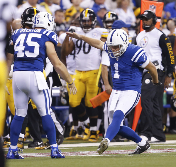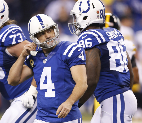 Trailing 14-0, the Colts dropped into punt formation from the Steelers' 43. Instead of kicking, punter Pat McAfee rolled to his right and completed a pass to tight end Erik Swoope for a 35-yard gain to the Steelers' 8. Two plays later, Scott Tolzien rifled a pass to Donte Moncrief, who made a diving catch in the front of the end zone.