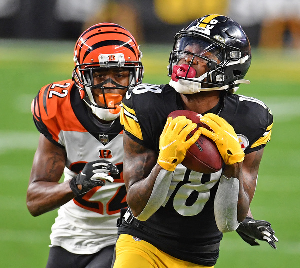 One series later, they didn't waste a big play. Roethlisberger finally connected on a deep pass when he hit receiver Diontae Johnson down the left sideline for a 46-yard gain to the Bengals 28. After Roethlisberger hit James Washington for 16 yards, he fired a quick slant to Johnson for a 12-yard touchdown. However, coach Mike Tomlin surprisingly elected to go for the two-point conversion, and Roethlisberger's pass to Chase Claypool failed, making it 12-0.