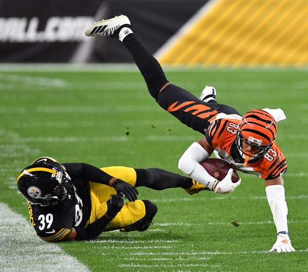 After the Steelers failed to capitalize on another Bengals mistake — rookie receiver Higgins fumbled after a being stripped by Cam Sutton and Steven Nelson recovered — the Bengals went 90 yards to eight plays to cut the lead to 12-7 with 10:37 remaining in the second quarter. Higgins scored on a 2-yard pass from Burrow on fourth-and-goal, but the touchdown was set up when Higgins was wide open down the field for a 54-yard gain to the Steelers 22.