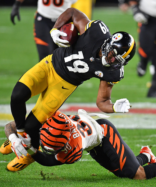 The Steelers came right back on a seven-play, 78-yard drive to pad their lead to 19-7 on an 8-yard touchdown pass from Roethlisberger to Smith-Schuster — a play in which Roethlisberger shook off the pressure of defensive end Carl Lawson to hit Smith-Schuster in the back of the end zone. But the drive was aided by a pair of back-to-back Bengals penalties — a roughing hit on Roethlisberger by defensive end Sam Hubbard and a pass interference call against cornerback William Jackson on Claypool at the Bengals 5.