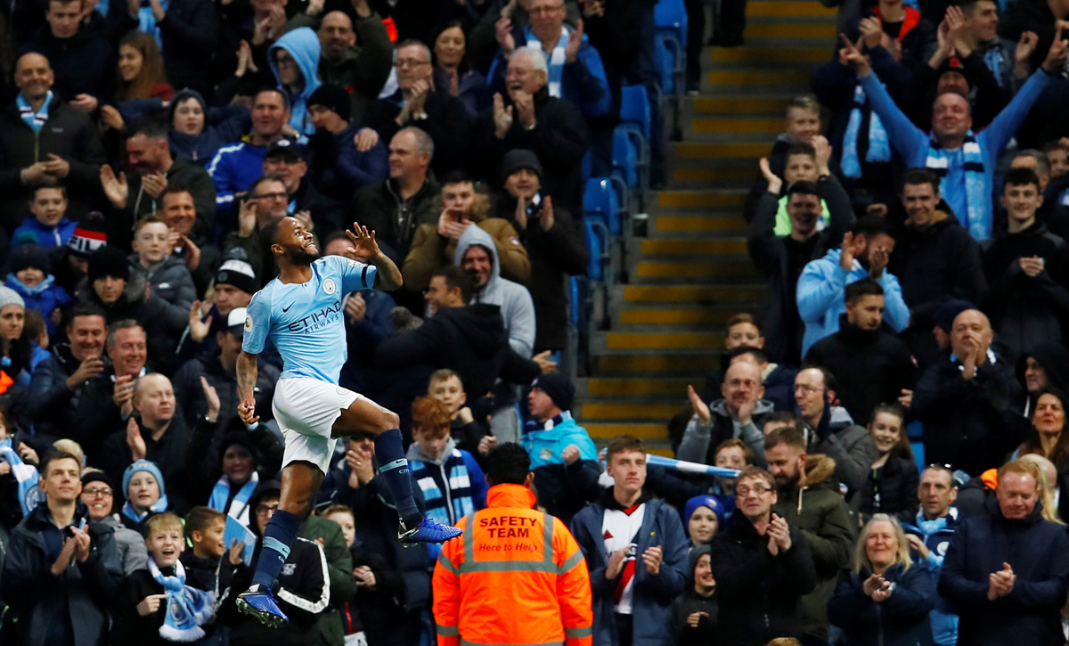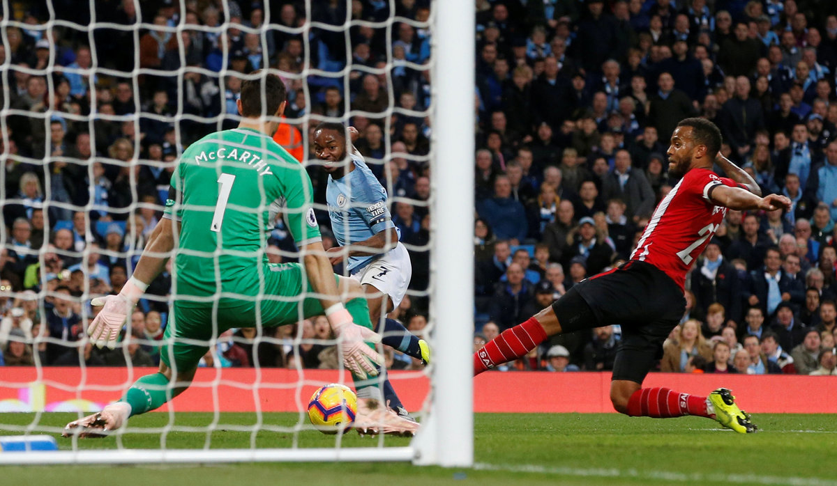 Raheem Sterling struck twice as Premier League leaders Manchester City crushed Southampton 6-1 at the Etihad Stadium on Sunday, the fourth time they have scored five or more goals in the 11 games so far this season.