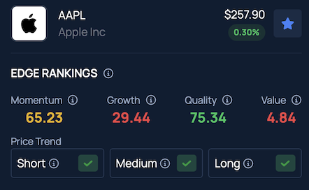 Benzinga's Edge Stock Rankings rank AAPL's stock quality in the 75th percentile, highlighting its performance compared to Meta and other peers.