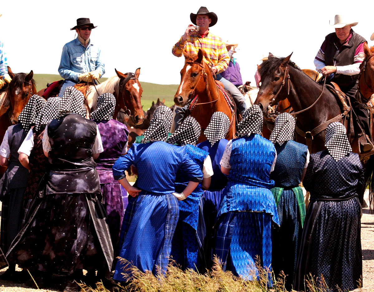 Canada is home to most of the world's Hutterites, some 35,000 people, who are known for their distinctive clothing. Women typically wear long apron dresses and head coverings, while the men don dark pants held up with suspenders and often wear hats.