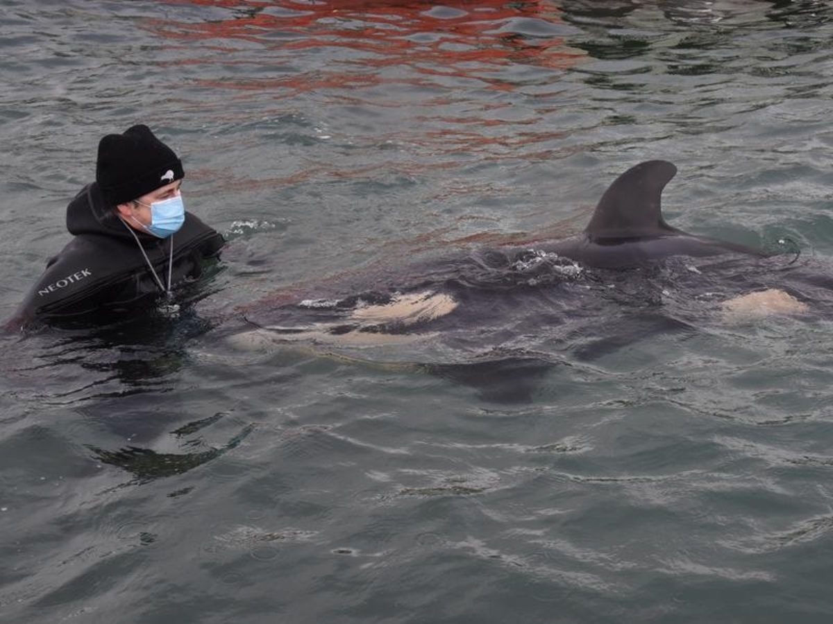 Volunteers are taking turns jumping into freezing wintry waters to spend time with the animal, comforting him in a makeshift pen at the Plimmerton Boating Club.