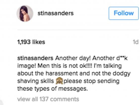 Sanders shared one of the images on her Instagram page to highlight the issue on Thursday. While most commenters backed her post, a number accused her of encouraging men and criticised her for speaking out, suggesting she only has herself to blame for the images.