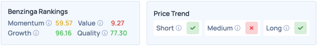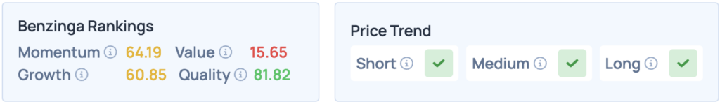 - The stock scores high on Momentum and Quality in Benzinga’s Edge Stock Rankings, with a favorable price trend in the short and long terms. Click here for deeper insights into the stock, its peers and competitors.