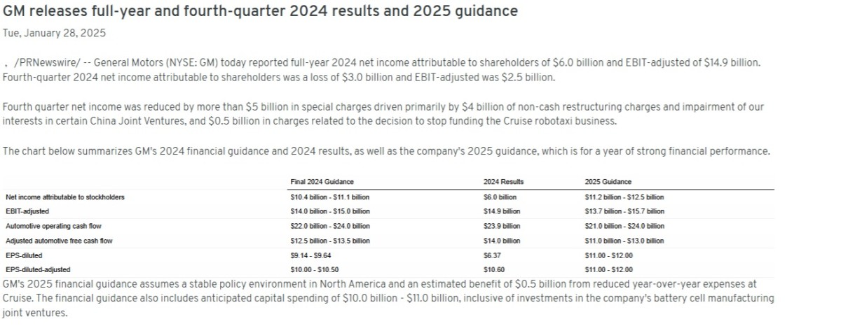 GM sees net income of between $11 and $12 per share for 2025, topping Wall Street's $10.85 consensus, after selling 2.7 vehicles last year and earning $10.60 per share.