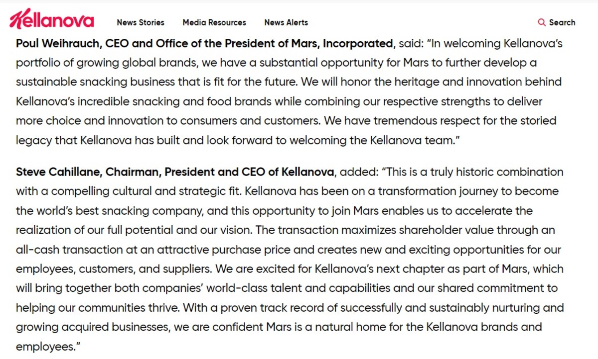 Kellanova (K) , the snacks-focused division spun out from WK Kellogg (KLG) last year, powered higher in premarket trading after agreeing to a $36 billion takeover from privately owned candy maker Mars.