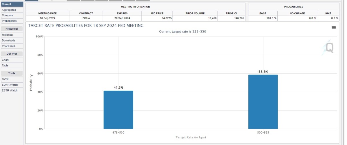 The CME Group's FedWatch tool suggests a 52.5% chance of a 50 basis point rate cut from the Fed when it meets next month in Washington. The odds of a 25 basis point reduction are pegged at 47.5%.