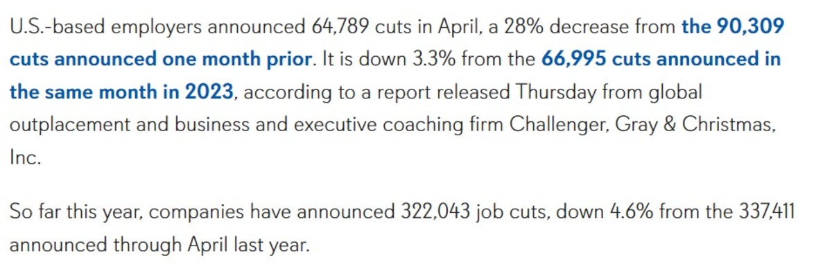 Challenger Gray's closely-tracked report on corporate layoffs, meanwhile, showed a 3.3% decline in April when compared to last year and a big slump from the overall tally in March.
